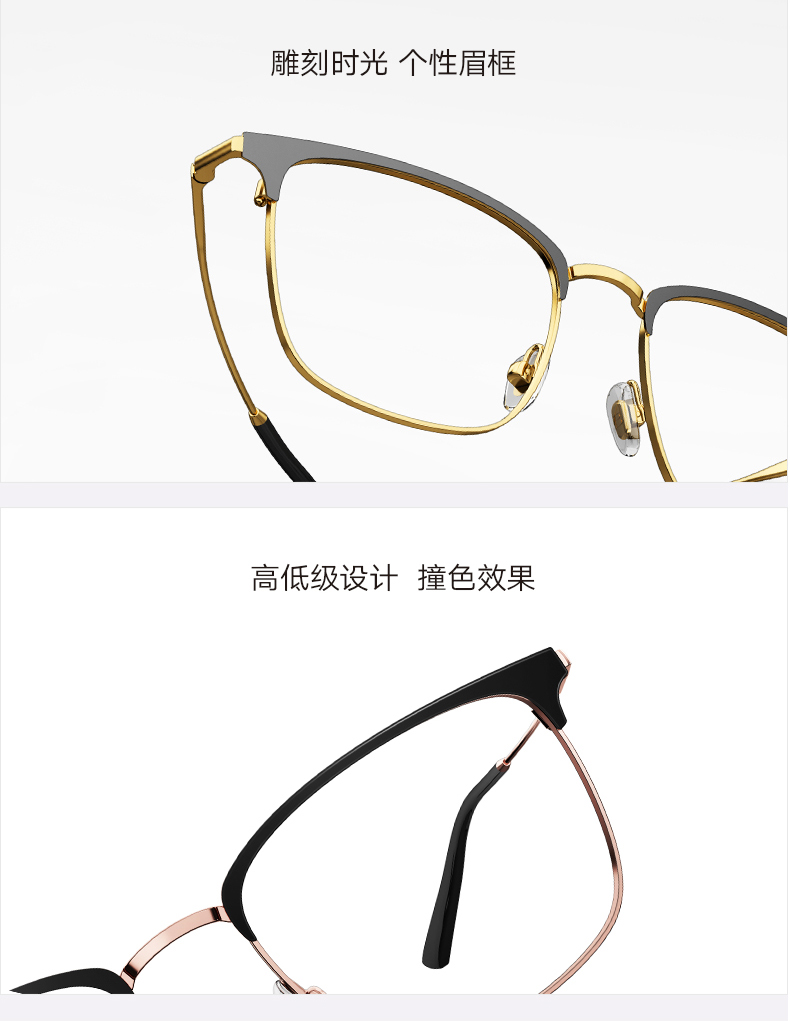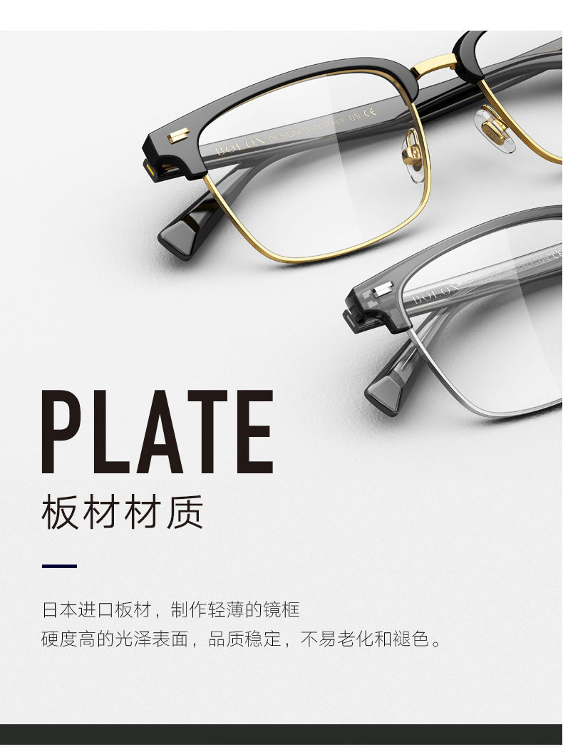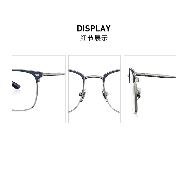镜框采用合金材质制成,仅重14.3g超轻,长时间佩戴也不会感到劳累;镜框上沿和镜脚使用日本进口板材,非常轻薄、硬度高、表面光泽度高,不易老化褪色。双层可调节鼻托,增加了佩戴的舒适性。