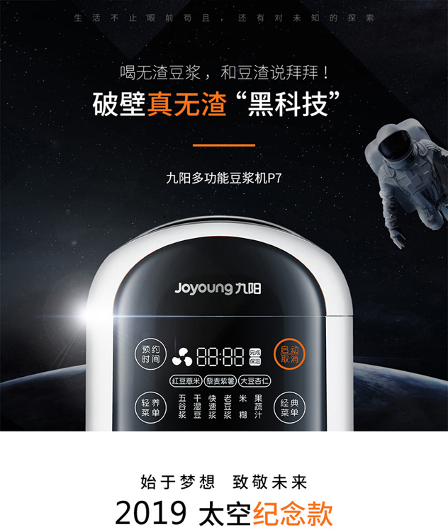 九阳 P7 精磨免滤豆浆机,2019太空纪念版,弧形超大触摸面板灵感来源于宇航员头盔造型,10大功能菜单,视野更清晰,使用方便。搭载1300w大功率破壁电机,转数可达15300每分钟,配合5刃3棱精钢破壁刀和魔立方研磨器,粉碎破壁食材,50目滤网过滤细腻无渣。
