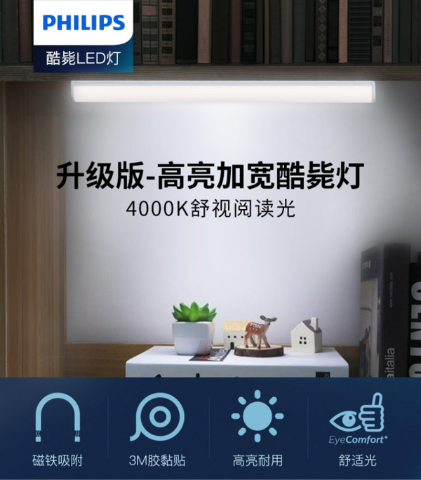 天猫飞士家居专营店,¥69.9元 家装季价,-40元优惠券,=29.9元 到手价,第1款此价,4000K色温舒适护眼阅读光,升级加亮加宽,横置式设计,相比台灯照亮的范围更大,更省空间,无损安装,安装方便简单,使用方便,如果恰好书桌上部分有位置,这种灯具是很好的选择。