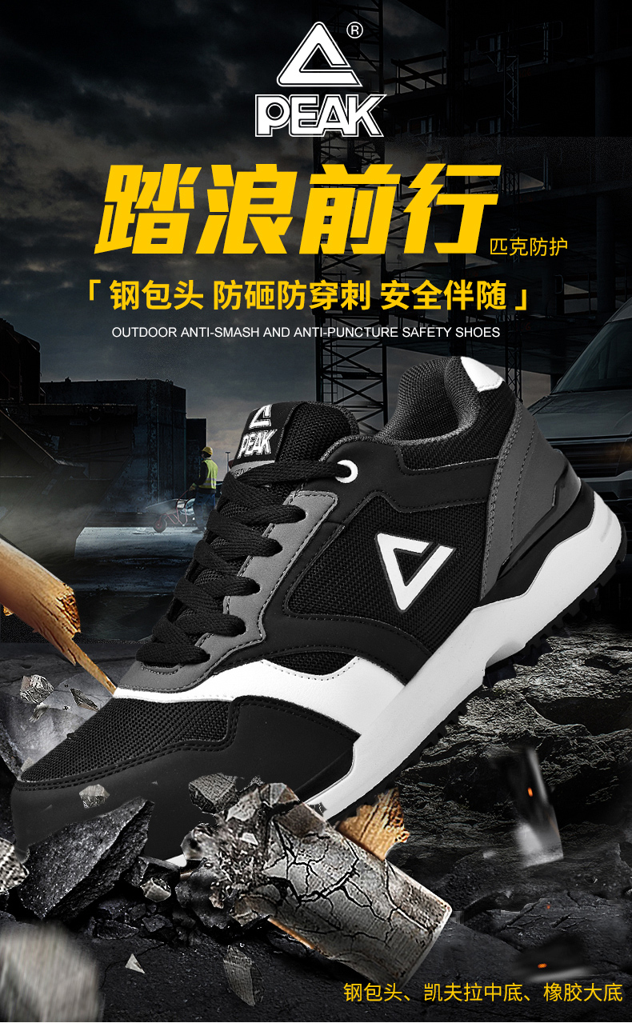 这款匹克运动鞋是一双劳保鞋,钢包头、凯夫拉中底、橡胶大底,防砸、防穿刺、防滑透气。鞋头采用钢头包头加固设计,防砸脚趾,同时打造宽松的前掌鞋舱,舒适不挤脚。