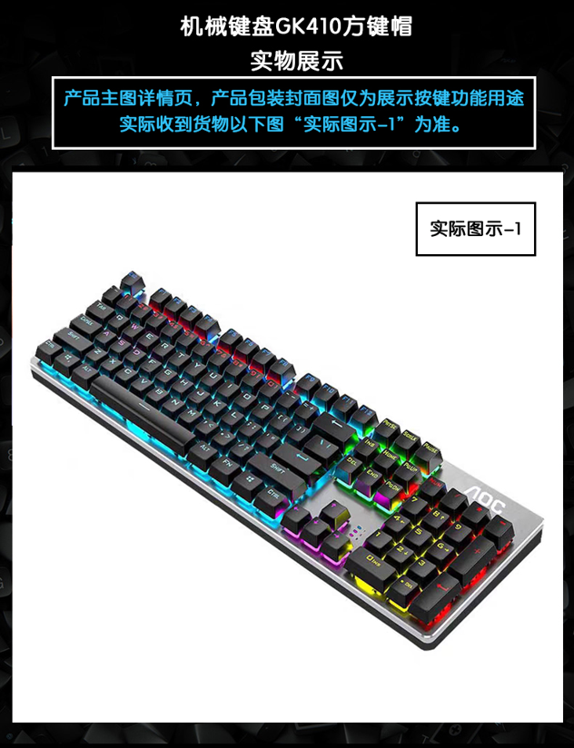 这是AOC的基础款机械键盘,真机械轴体,人体工学高低键设计,按键不累,双色注塑键帽,耐磨不掉色,可调节呼吸灯搭配21种灯效,使用方便,金属上面板+磨砂质感,具有强悍的耐用性,线材为编织抗干扰磁环接口,坚固耐用。