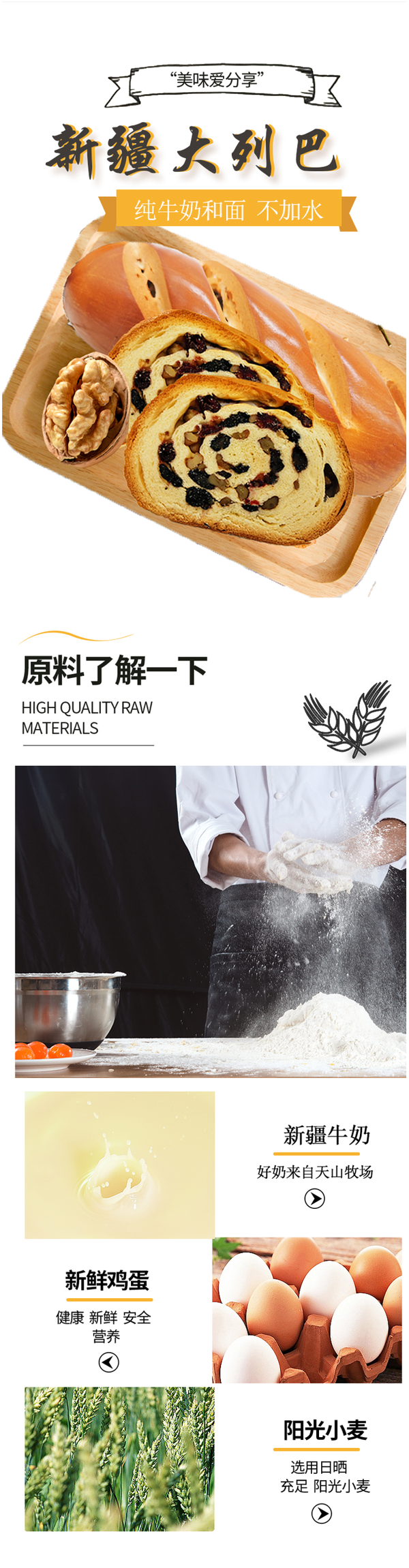 这款以稀正宗新疆坚果大列巴,选用新疆的阳光小麦为主料,使用新疆牛奶和面,未加一滴水,再混入新鲜鸡蛋、核桃仁、葡萄干、燕麦片、酥油、白芝麻、小米、玉米糁,在制作过程中不添加防腐剂、色素,现做现发,保证新鲜。
