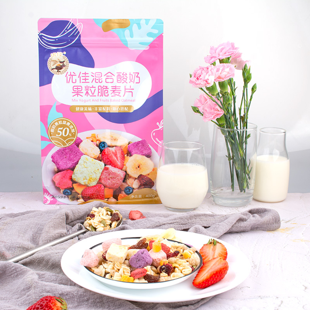 原料甄选:谷物燕麦片、谷物球、红葡萄干、南瓜子仁、蔓越莓片、香蕉片、木瓜丁、芒果丁、冻干草莓酸奶块、冻干蓝莓酸奶块、冻干黄桃酸奶块、冻干草莓片、椰蓉。科学配比,营养均衡,热量低,轻烘焙更健康,鲜香酥脆,营养又美味,饱腹代餐,可开袋即食,还可搭配牛奶、酸奶冲食。