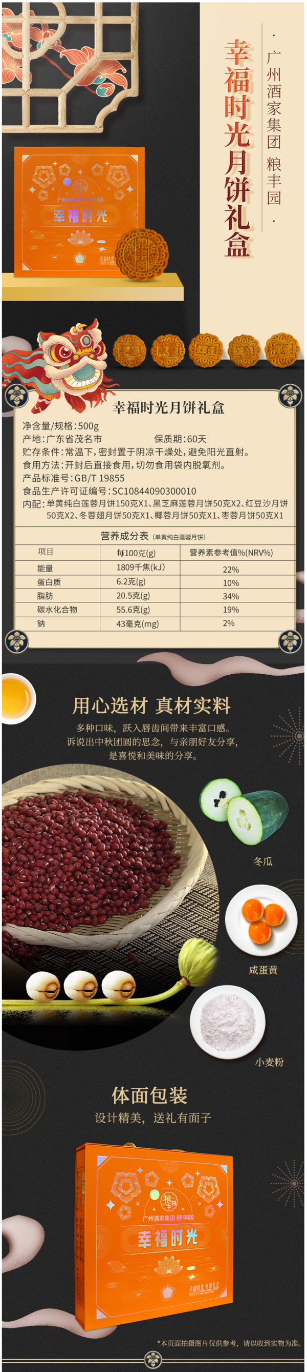 这款粮丰园 幸福时光广式月饼礼盒,蛋黄纯白莲蓉月饼 150g*1、黑芝麻莲蓉月饼 50g*2、红豆沙月饼 50g*2、冬蓉翅月饼 50g*1、椰蓉月饼 50g*1、枣蓉月饼 50g*1,共8饼6味/500g。