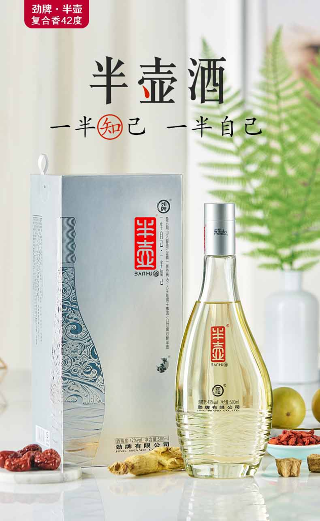 半壶酒开发参考标杆是五粮液,健康内涵为降血脂,减轻肝损伤。采用传统酿造工艺与现代生物发酵技术的有机结合,采用优质糯米、高粱和小麦精心酿制,在取人参、沙棘、葛根、罗汉果、枸杞子、玛咖粉、山楂七味不同原料陈酿多年。具有清香、浓香、酱香、三种复合香,酒体绵柔顺喉,醇厚回香。