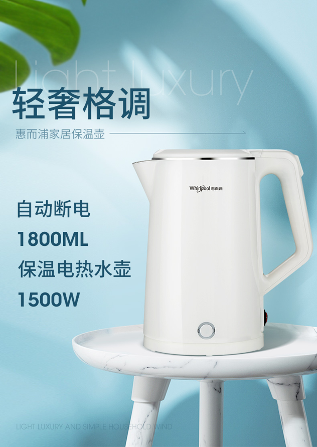 这款 Whirlpool 惠而浦1.8L电热水壶,美国百年品牌,采用食品级304不锈钢材质壶身,优质控温器,准确控温,自动断电防干烧,很安全。