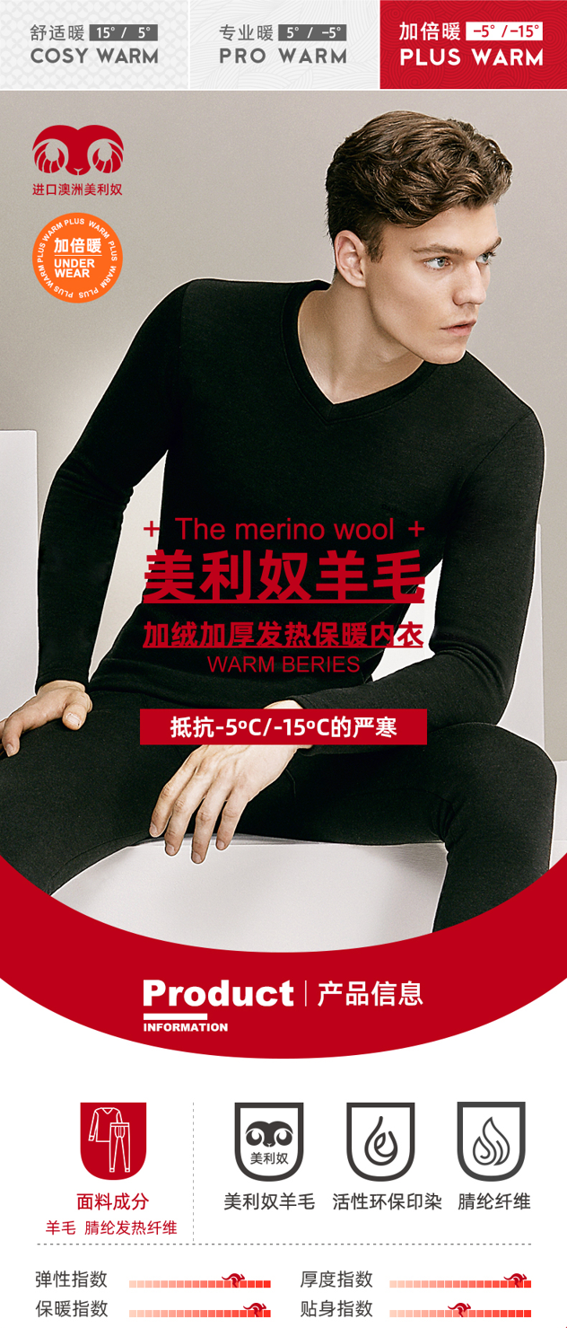 这款袋鼠保暖内衣,采用澳洲进口美利奴羊毛,搭配自发热腈纶纤维、氨纶弹性纤维混纺而成,在保证亲肤保暖的穿着体验同时,做到良好的弹性,贴身穿没有紧绷束缚感,进一步提升穿着体验。修身合体版型,内穿不臃肿,衣领、袖口、脚口与均为罗纹设计,不易变形松垮,版型更挺括。纯色简约款式,内穿不漏,百搭穿着