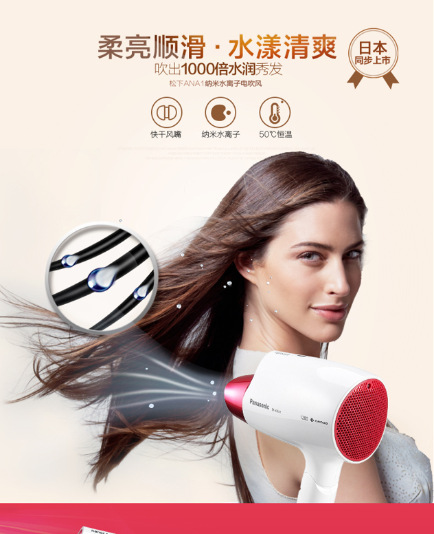 这款松下的EH-ANA1是纳米水离子的经典款,因为有水离子的参与,其最大的特点就是吹完后,头发不会干枯毛躁,会变得滑滑的,而且能提高头发的光泽度,是优于负离子的护发黑科技,松下就是水离子电吹风做的最好的厂商之一。