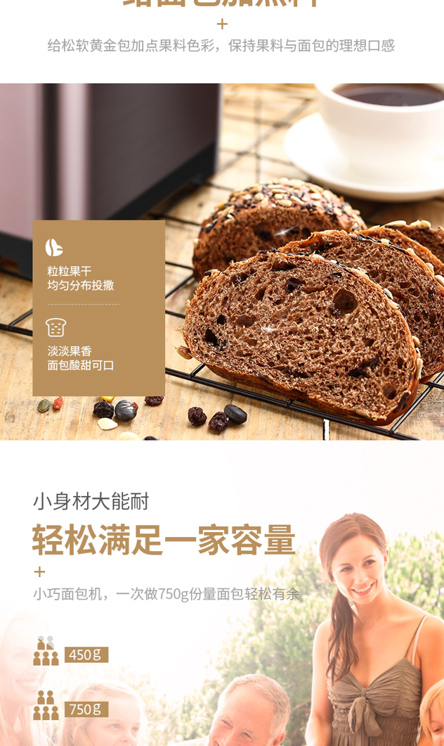 有三种烧色可选:浅烧色,外皮口感松软;中烧色,外皮口感香甜;深烧色,外皮口感酥,内里松软;两种重量:450g、750g;有1小时保温程序,面包完后,会自动进入1小时保温程序;