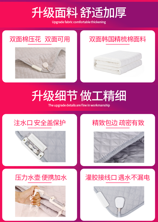 细节上:注水口可拆卸封盖,安全不漏水;接线处灌胶,遇水不漏电,有高温过热自动断电保护成人孩子都能用,由于防水,即使孩子尿床也不怕;1-12小时随意定时,到时自动断电,9档温度随意调控。