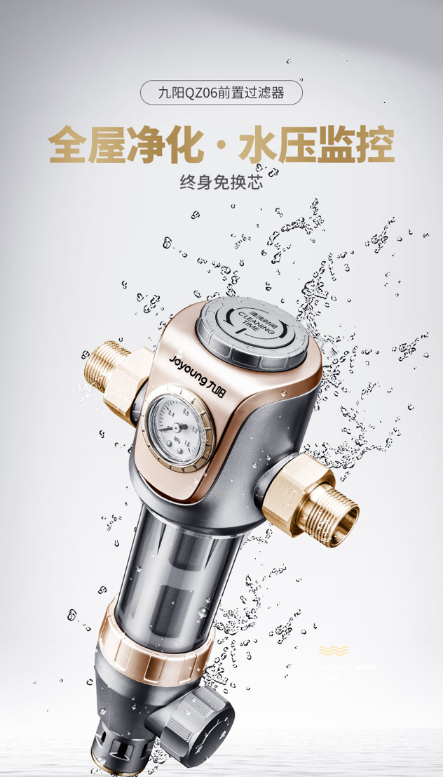 这款九阳前置净水器,主体是国标无铅环保铜,抗氧化,耐腐蚀,时尚寿命长,减少二次污染。316不锈钢滤网,永不需要更换,减少后期维护费用。配备精密压力表,实时监测进水压力,顶部带有记忆拨盘,记录用户每次清洗的时间,提高滤芯使用率。