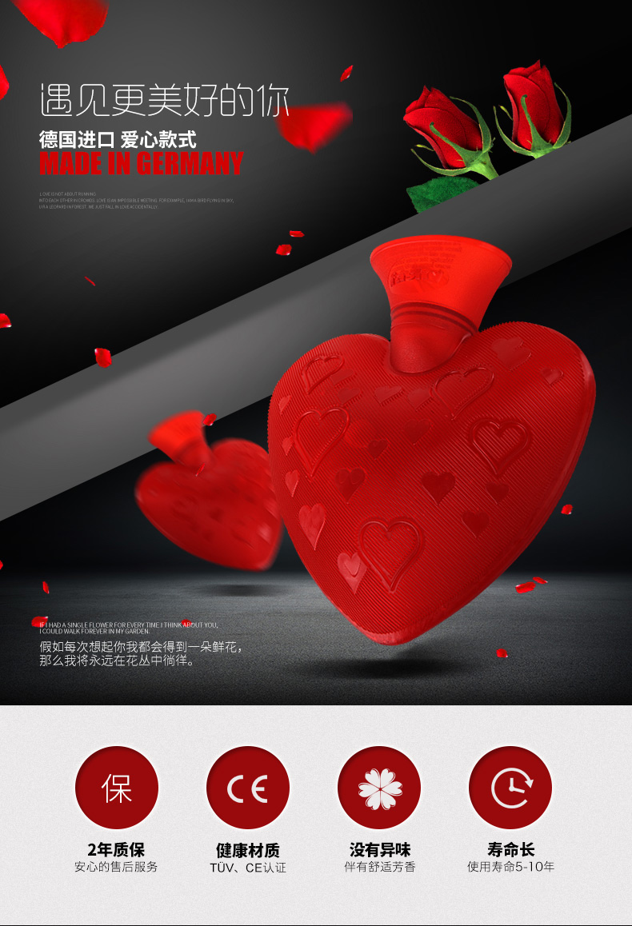 这款费许Fashy热水袋,半透明设计,容量是0.7L,美好的心形设计,寓意温暖你一辈子,既实用又充满情义。这款热水袋除了装热水,还能装冷水。采用德国进口的PVC材质制成,极其强韧,可承受汽车碾压而不爆裂,使用寿命长达5-10年,相当于10个普通热水袋。