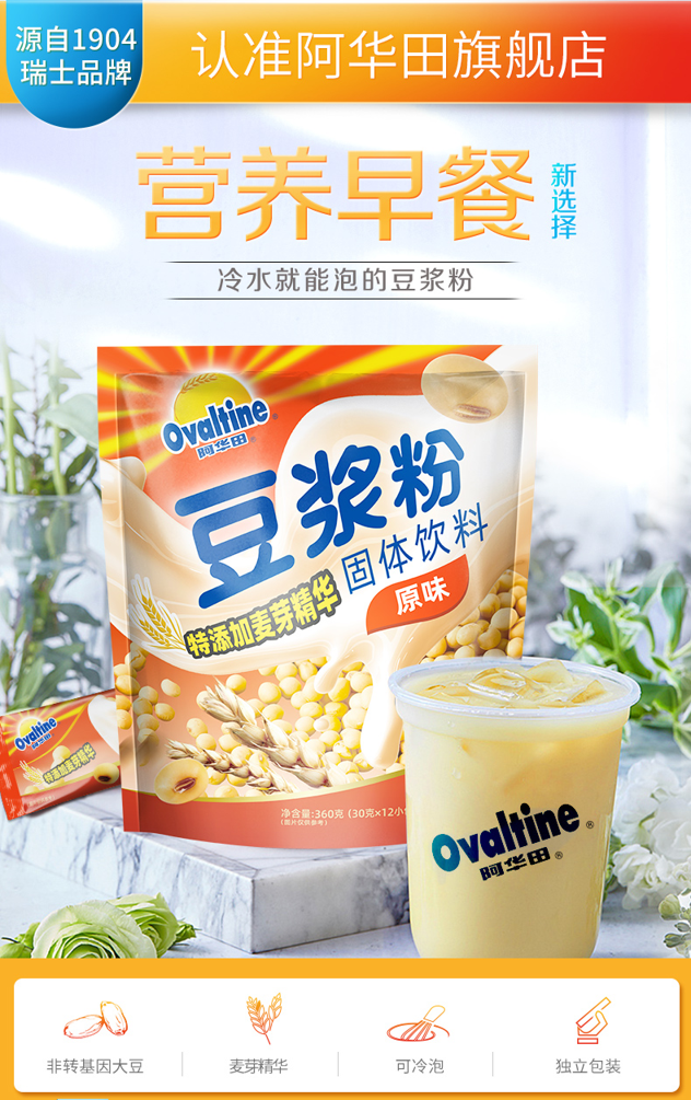 瑞士百年品牌,阿华田 经典原味甜豆浆粉,采用优质非转基因大豆制作,豆浆粉经过去渣处理,去除豆腥味,口感香浓顺滑,特别添加了进口大麦提取的麦芽精华,增加了自然谷物气息,同时富含多种人体所需氨基酸、维生素、矿物质和膳食纤维。可冷泡,不结块,1分钟即可享受健康美食!