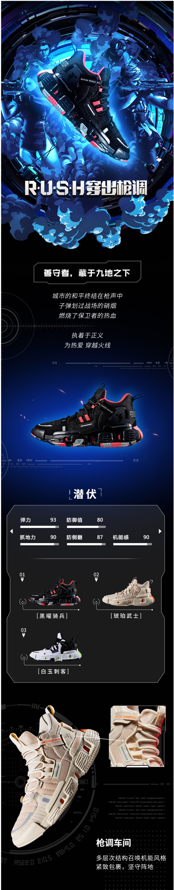 这款361度 男高帮减震篮球鞋,是《穿越火线》篮球联名鞋款,鞋身是网布+合成革+TPU+松紧带的丰富层次结构搭配,塑造鞋款浓厚的机能风格,突显军事联名主题。