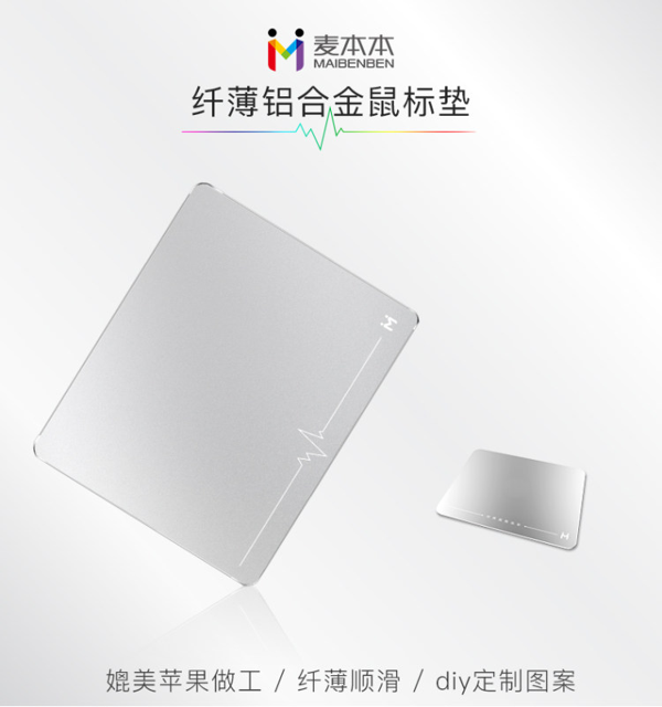 麦本本铝合金鼠标垫,尺寸为22*18cm,厚度2mm,采用铝合金一体冲压成型,表面经过阳极氧化喷砂处理,手感顺滑。橡胶背面,拥有特制底纹,不易滑动。