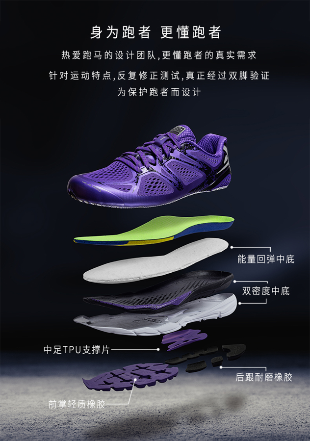 双密度的EVA中底,缓震回弹效果更好,脚感舒适不生硬;中足TPU支撑片,保证鞋型的支撑保护效果;前掌是轻质橡胶,后跟是耐磨橡胶,加上锯齿防滑纹,抓地力好且耐磨。鞋楦符合国人脚型。