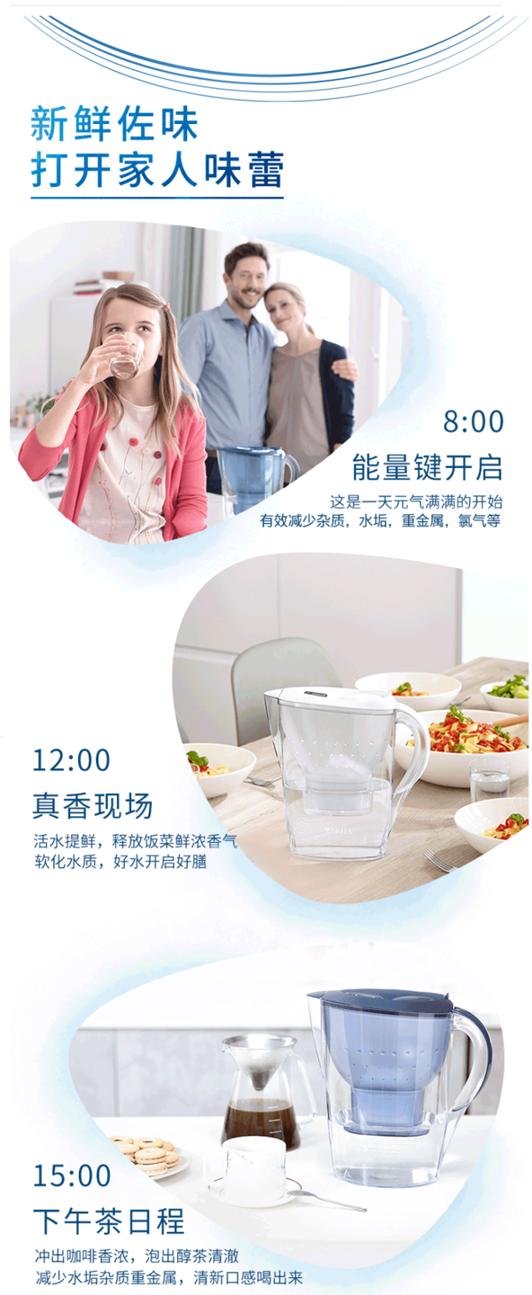 德国的Brita碧然德是过滤水系统行业的领头羊,这款Marella 海洋系列滤水壶容量为3.5L,每次可过滤2L,采用BPA-Free无毒塑料,防滑手柄,橡胶软脚,指压式开闭注水口,不用打开上盖就可加水,使用比较方便。