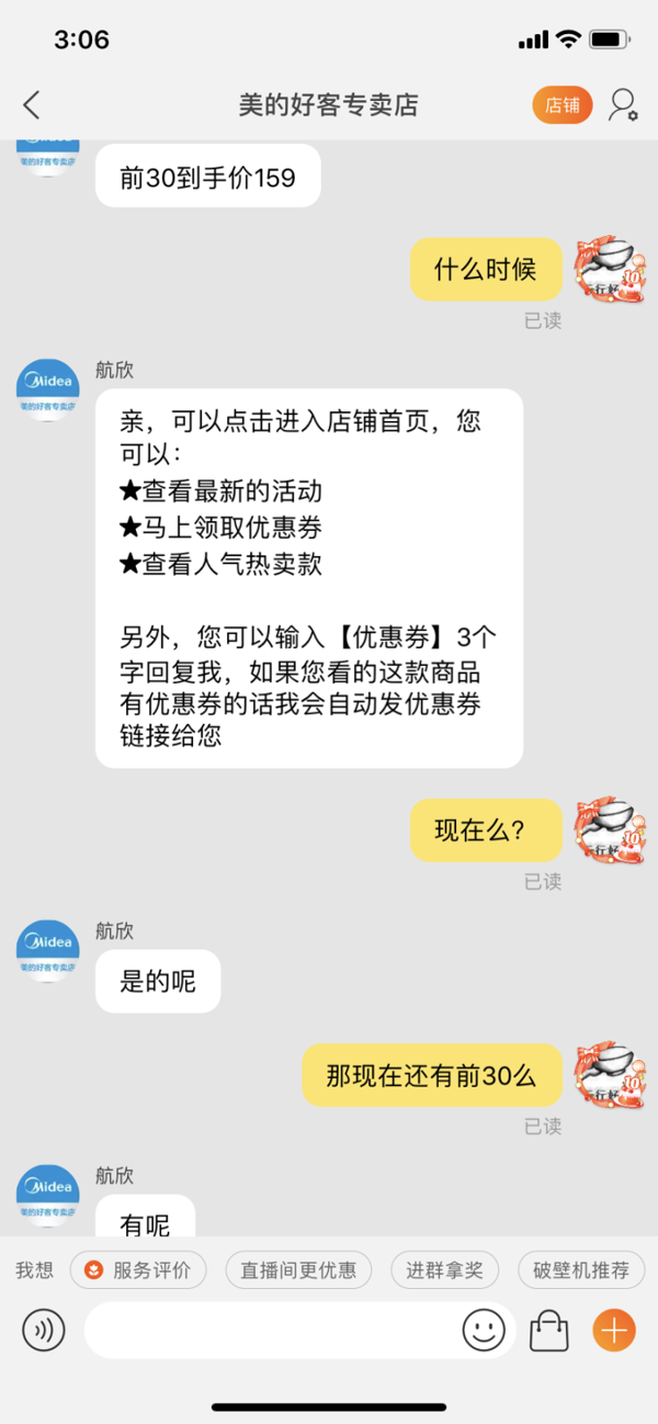 天猫美的好客专卖店359元,可领70元优惠券,实付,前30名下单159元到手(需联系客服),应该是客服为了销量搞出来的,我问还剩了多少名额也问不出来,不过这款此前最低289元,妥妥的神价格。