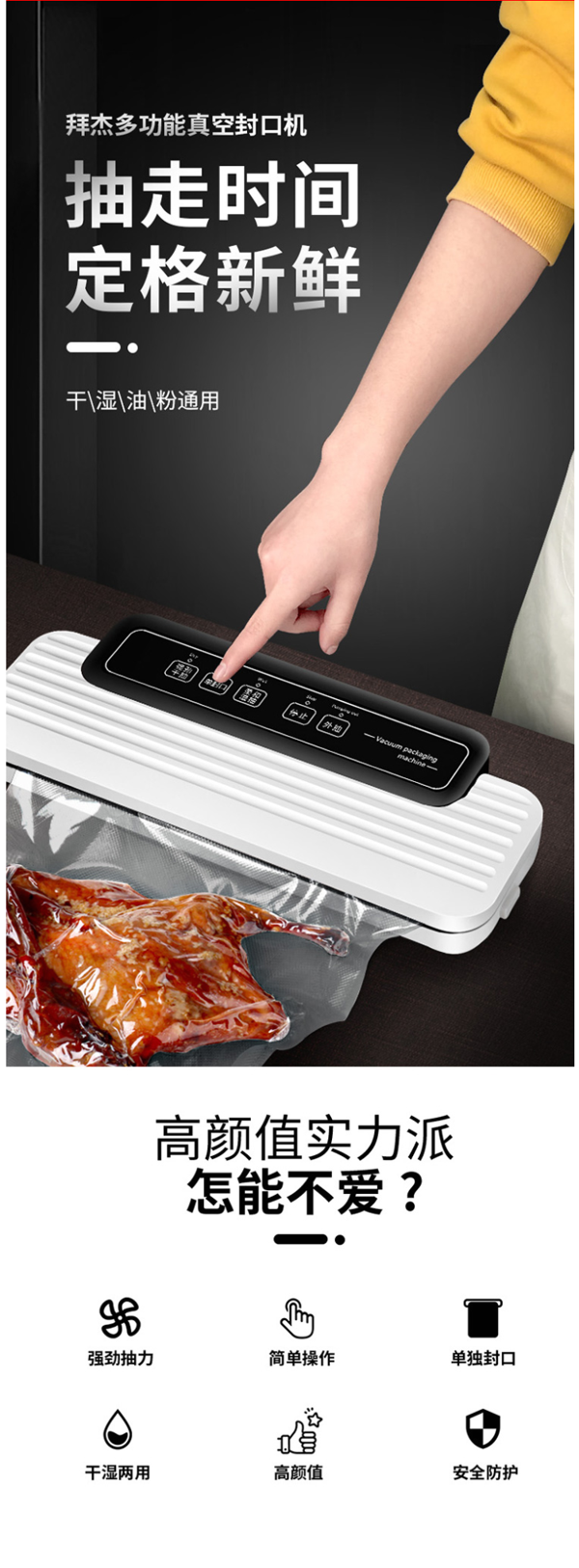 这款拜杰 食品抽真空包装机,干、湿、油、粉通用,强劲抽力形成完全真空真空状态,让食品存储更新鲜持久。有干、湿两种模式,适用于不同的食物抽真空并封口。