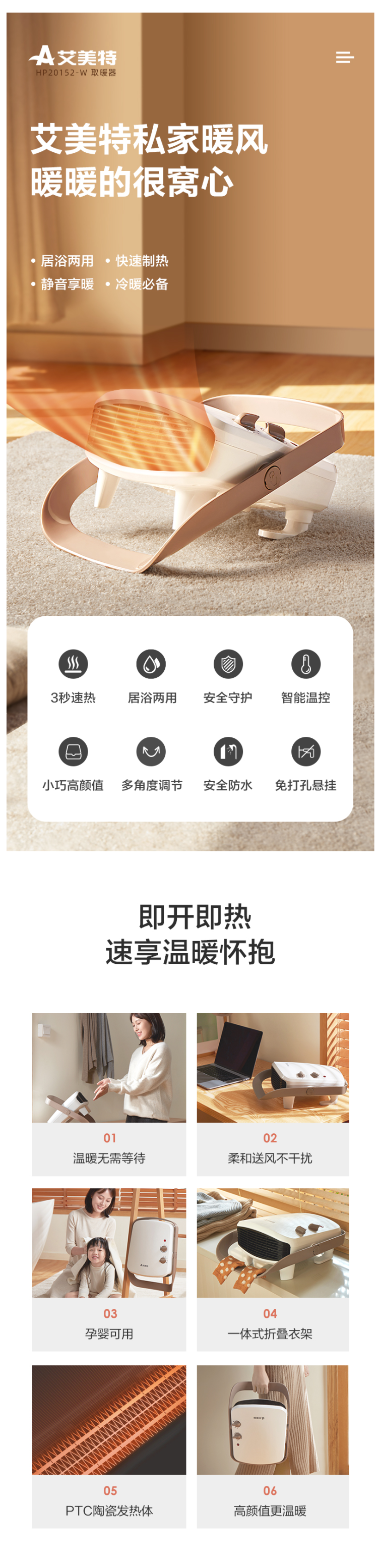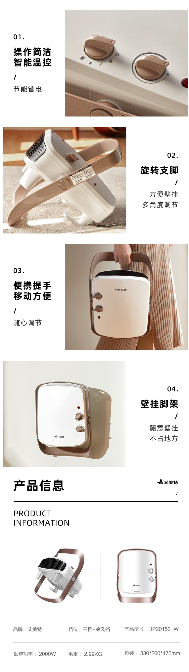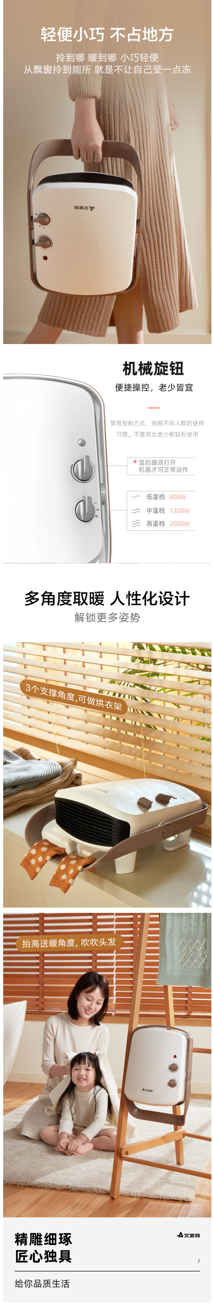 这款艾美特 HP20152-W 暖风机,功率是2000W, 能壁挂也可落地,无论是日常卧室客厅,还是浴室都能用,可多角度调节送风,范围广;