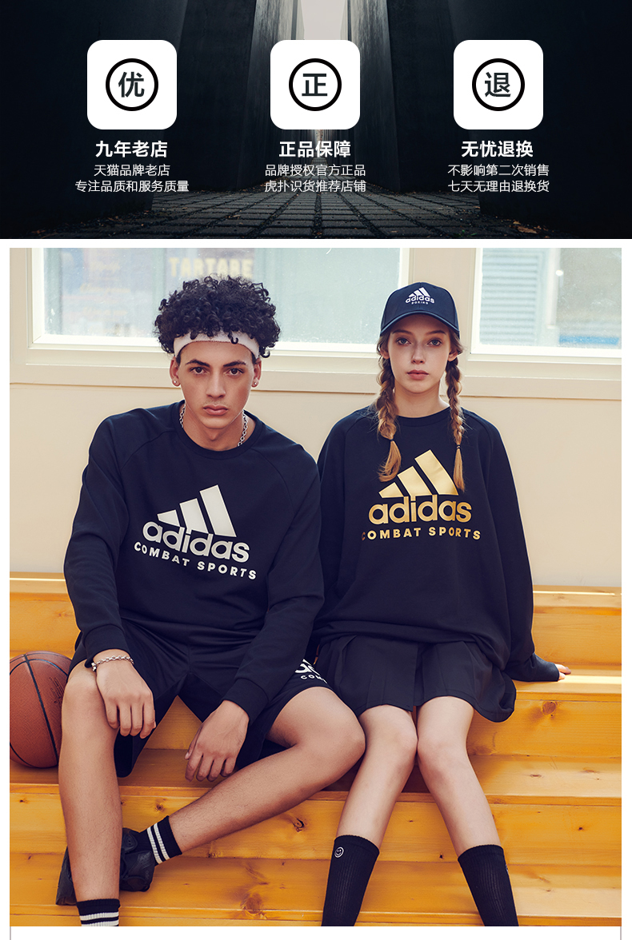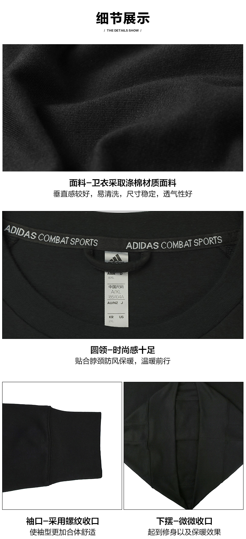 这款阿迪达斯男士卫衣是经典的武博系列,是为搏击、跆拳道等运动设计,兼具保暖和透气性,这款卫衣采用棉涤混纺面料,垂感较好,易清洗,尺寸稳定,透气性好,袖口采用螺纹材质收口,袖型更加合体舒适,下摆微微收口,起到保暖和修身的效果。