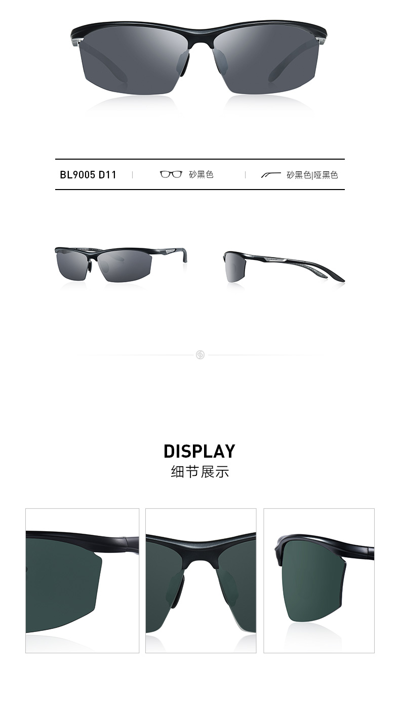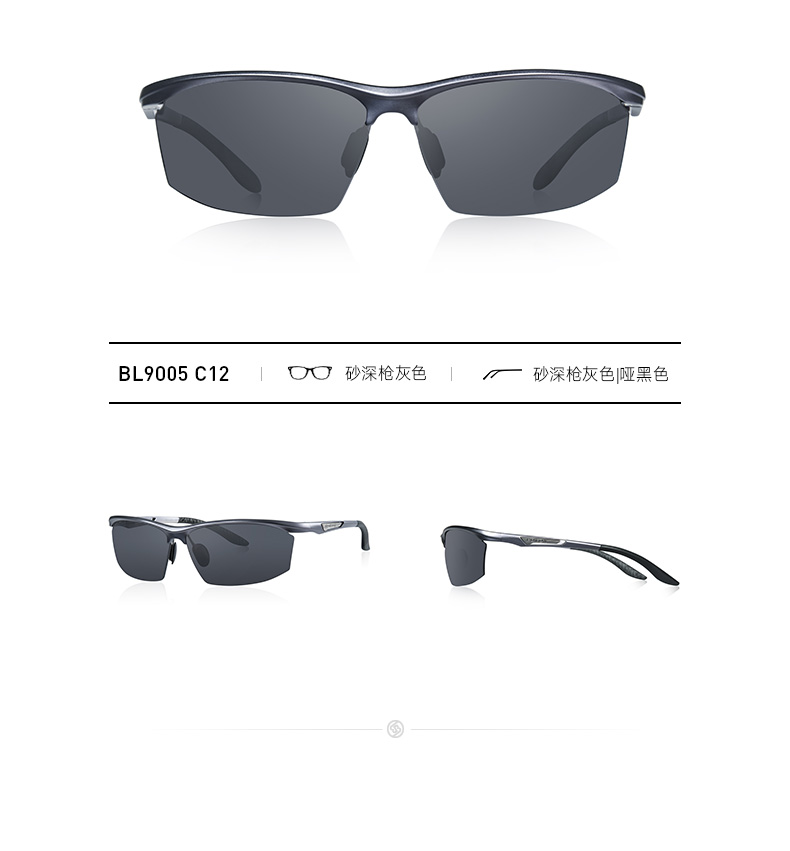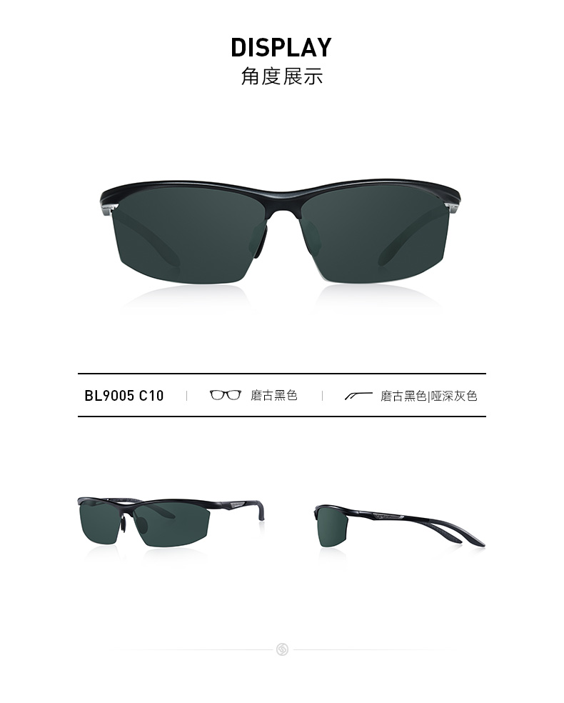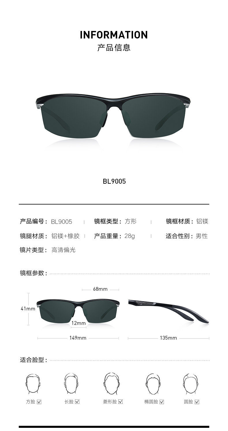 这款暴龙BL9005男太阳镜,在设计上是偏向于运动风的骑行眼镜,适合运动时佩戴,如打网球,也可以开车时佩戴。镜框是铝镁合金制成、镜腿则是铝镁+橡胶,整重28g,适合方形、长形、菱形、椭圆形、圆形脸佩戴,基本上完全不挑脸型。
