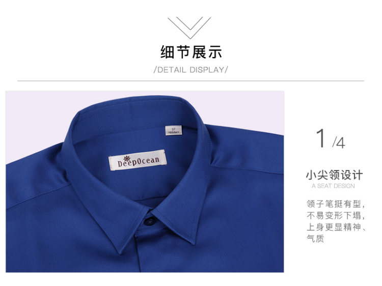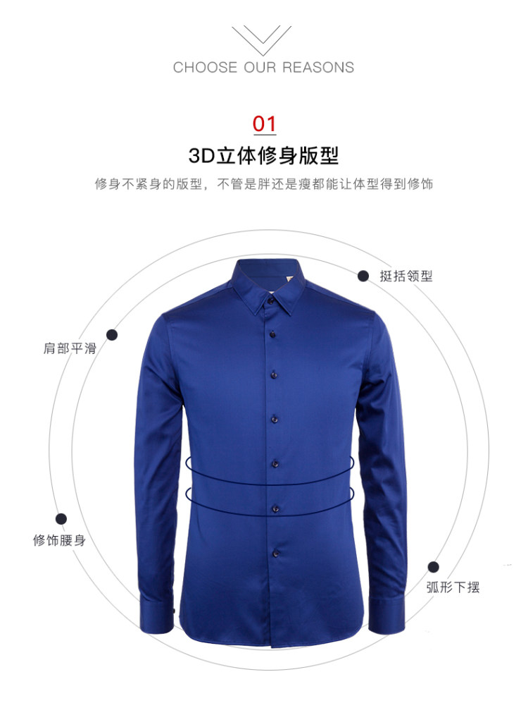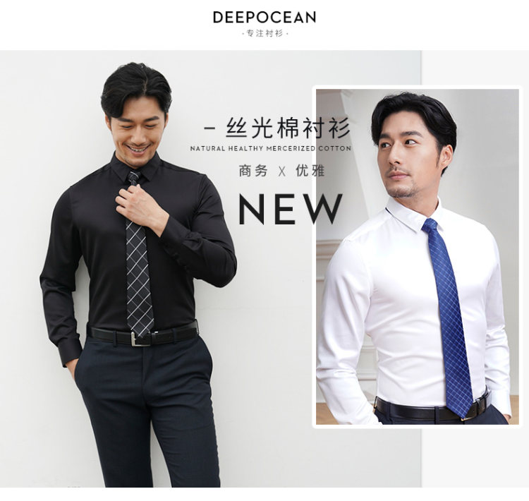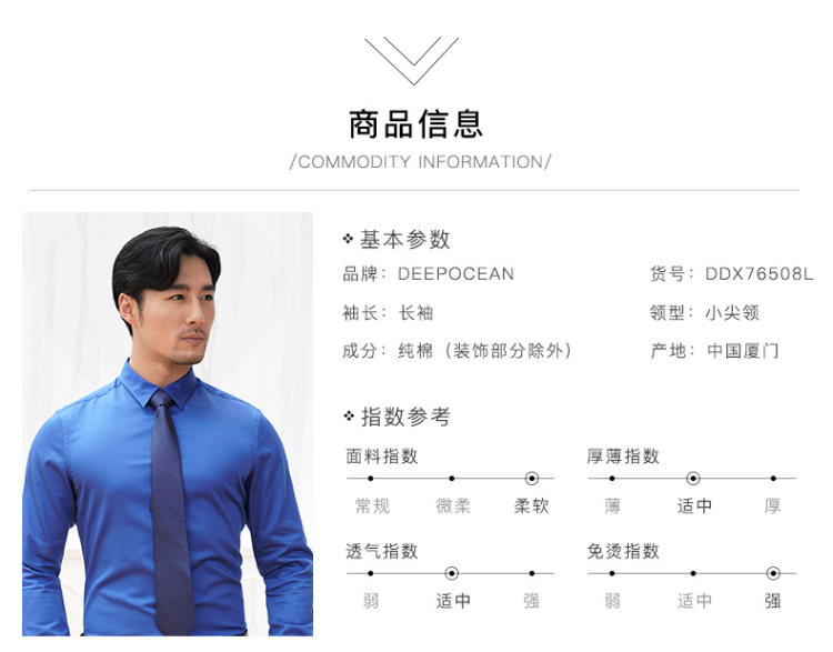 这款deepocean 男士长袖衬衫,春秋款,3D立体修身版型,能最大程度的修饰身形,衬衣上身更得体;采用高支丝光棉制成,面料经过特殊的树脂配方丝光工艺处理,手感柔软,光泽细腻,亲肤性非常好,上身舒适性高。