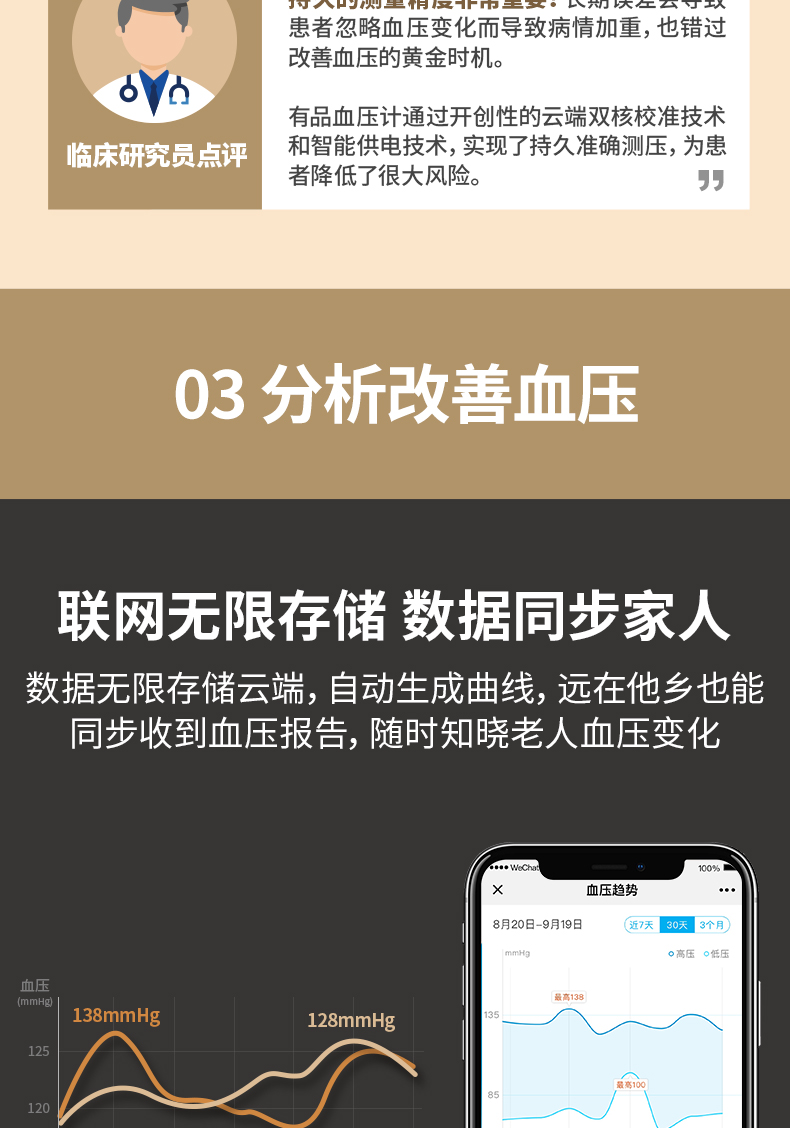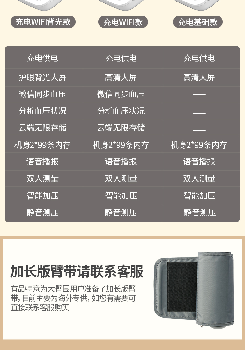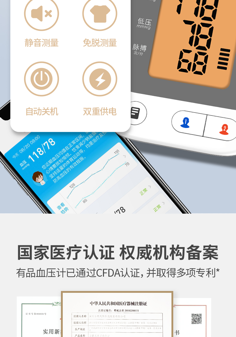 这款血压仪是医用级,测量高精准,智能充压自动测量,免脱测量,冬天使用更方便。内置升级核心传感器,可同时测量血压、脉搏,可分开双人测量。