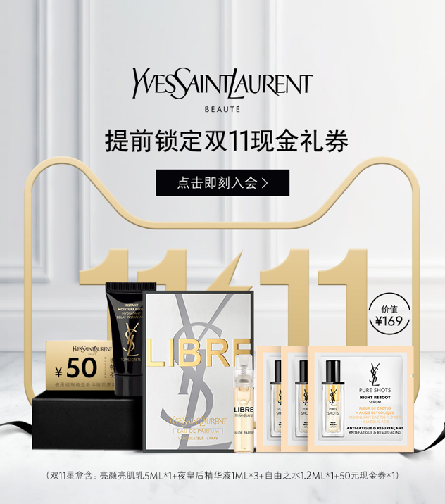 天猫YSL圣罗兰美妆官方旗舰店50元,可领10元优惠券,实付40元到手,赠送双11店铺抵扣卷50元,加入会员即可购买,包含夜皇后1ml*3,自由之水1.2ml,亮肌乳5ml,超值试用装福利来袭,不要错过哦~