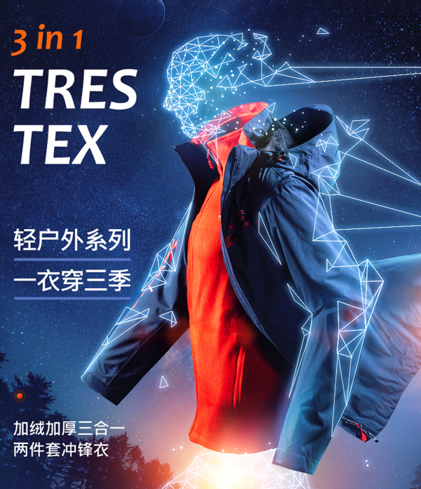 这款 趣越 男女款 三合一冲锋衣,属于轻户外系列,注重户外出行,运动时穿着的舒适度,三防科技面料轻盈,保暖,防水指数是5000mvp,透气指数是5000mm,可以抵抗中雨。内胆是双面双刷摇粒绒,保暖轻盈透气,可以让水分排出,确保干爽舒适,防起球。