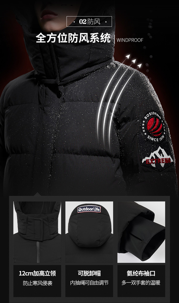 极寒系列是波司登2017年9月28日推出的旗舰系列羽绒服,都是中长款式,对标加拿大和韩系品牌。选用90%、蓬松度600+的优质鹅绒,标上了-30℃的温标。要知道加大拿鹅填充的还是鸭绒,只是充绒量很高。而且波司登的绒通过了国际RDS认证、瑞士蓝标认证的全球认可安心绒。