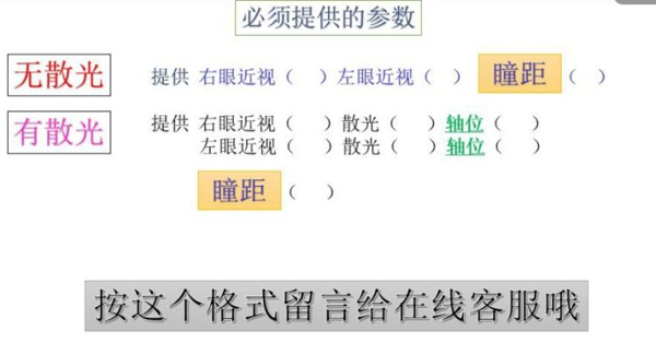 2.有散光:提供左右眼度数,散光度数,散光轴位,瞳距即可。