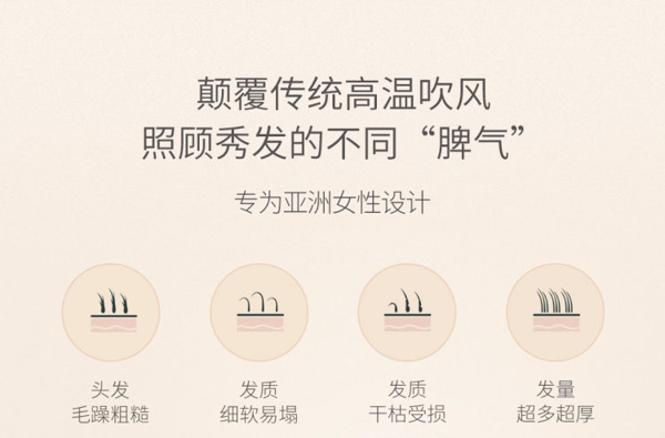 有冷风、热风2种模式,三挡可调;风嘴采用双层耐高温材质,通过磁吸连接机身,可随意调整角度,集中气流,快速打理各种发型,内置NTC智能恒定温控器,55度恒温区间,细软发质也可有效呵护,还精选了高灵敏度保险丝和主动过热保护装置,超出安全范围自动断电,双重保护更安全。