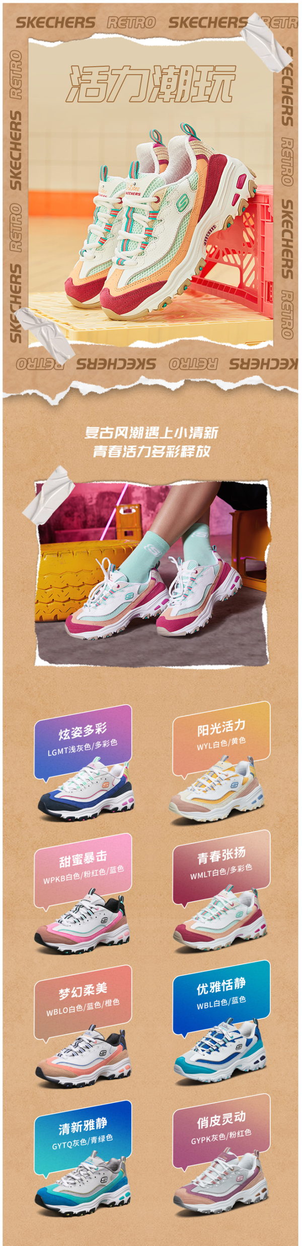 这款斯凯奇Skechers 女厚底老爹鞋,延续了当下流行的复古老爹鞋型,鞋面采用不同材质拼接而成,形成丰富的层级感,透露着浓浓的复古气息,颜色搭配也非常清新,少女气息十足。