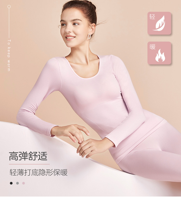 这款Ordifen 欧迪芬 女士保暖内衣套装 ,经典圆领,开度适中,可做内搭,便于搭配各种外衣。裸感舒适,轻薄保暖面料,任意裁剪设计更加贴合身形,隐形内搭,时尚无痕。61 %粘纤+37%锦纶+2%氨纶面料材质混搭,轻盈舒适,柔软细腻,具有较高的耐皱性与弹性恢复能力。无缝剪裁,更有利于保暖,轻薄不臃肿,还原你的曲线美。