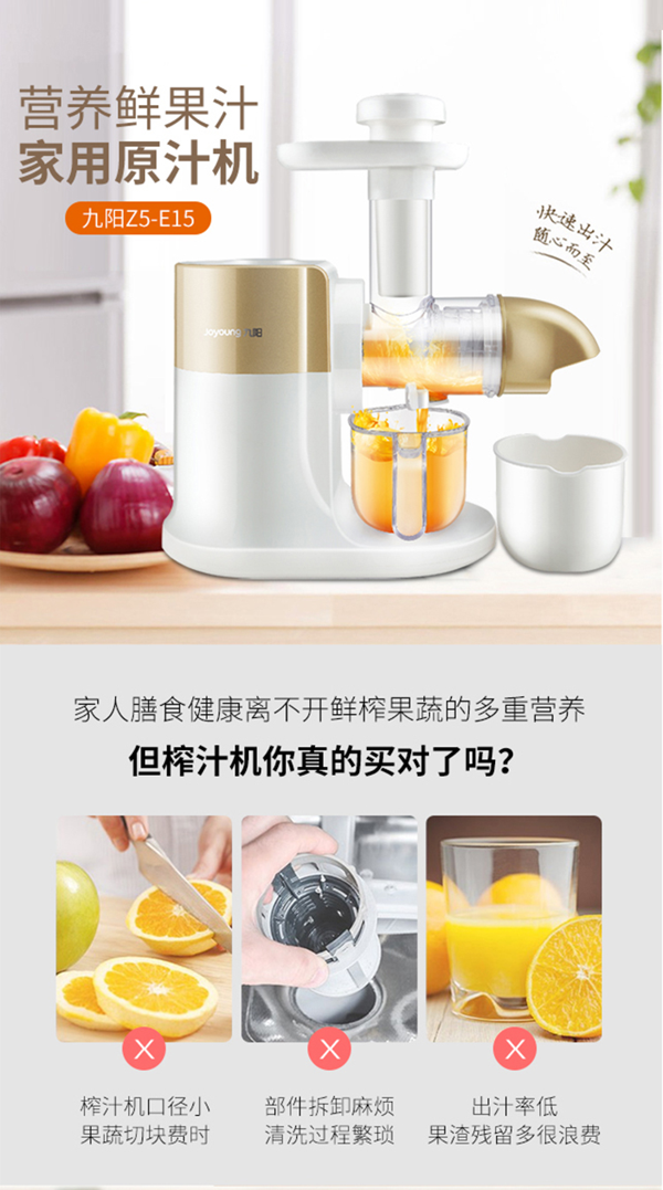 这款九阳 E15 卧式慢速原汁机,使用50-60转/分钟慢速榨汁(慢的比快的好),使果汁不易被氧化变色,保证果汁味道纯正,保留维生素营养成分。