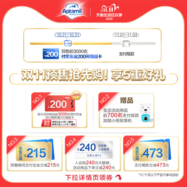 天猫国际爱他美官方海外旗舰店现预售价2108元,支付100元定金立减215元,1日前2小时付款再减473元,叠加240元优惠券,到手价1180元包邮,合147.5元/罐,近期好价,需要的买买可关注。