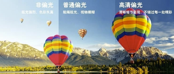▲高清偏光镜片、普通偏光镜片、非偏光镜片视野区别