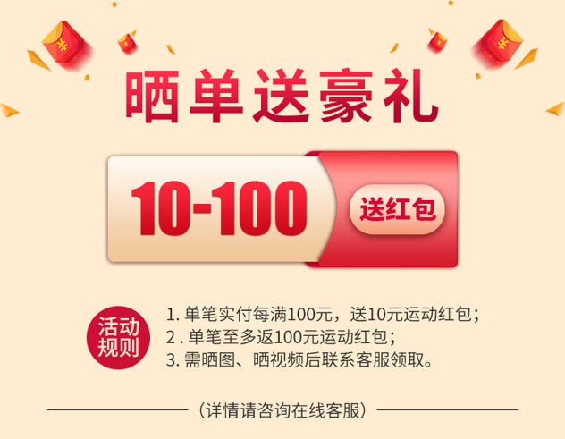 单笔实付每满100元送10元运动红包,共返现130元,需要晒图、晒视频后联系客服领取。