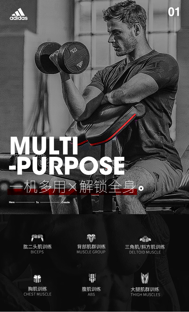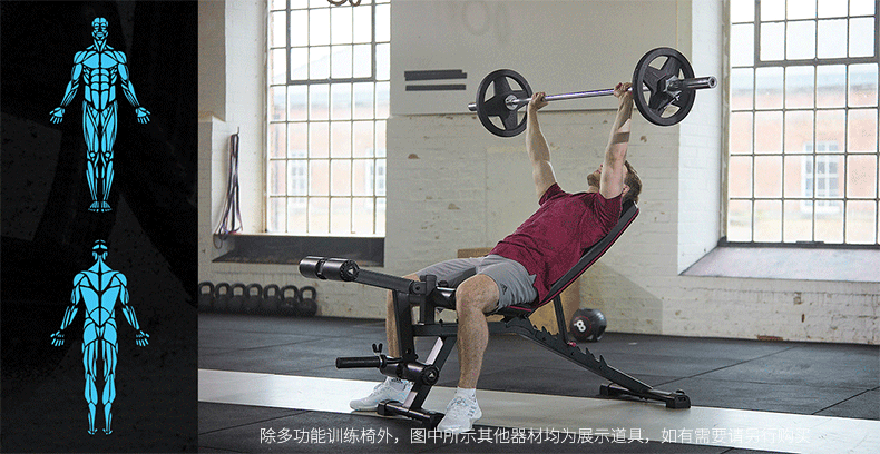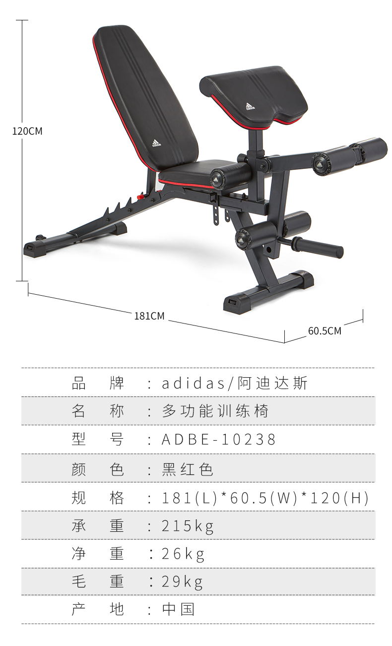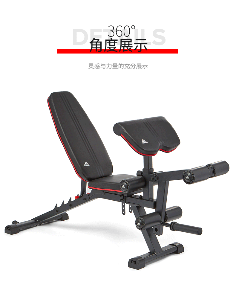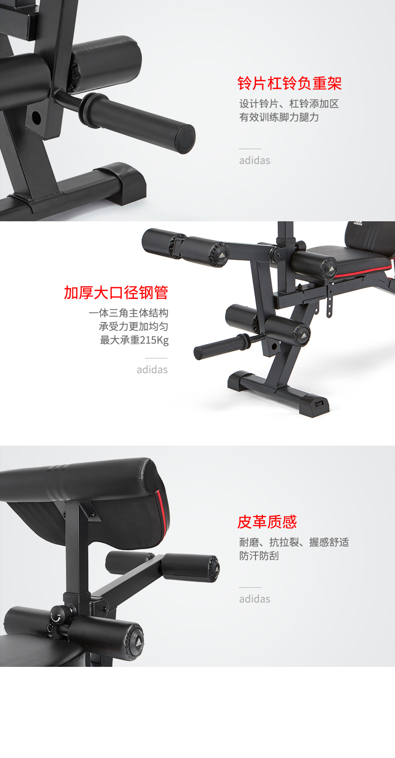 这款阿迪达斯ADBE-10238家用健身椅,是一款多功能卧推凳,配备有可调节二头肌板垫、铃片杠铃负重架、靠垫调节架、坐垫调节架,可以配合完成肱二头肌训练、背部肌群、三角肌训练、斜方肌训练、胸肌训练、腹肌训练、大腿肌群训练。