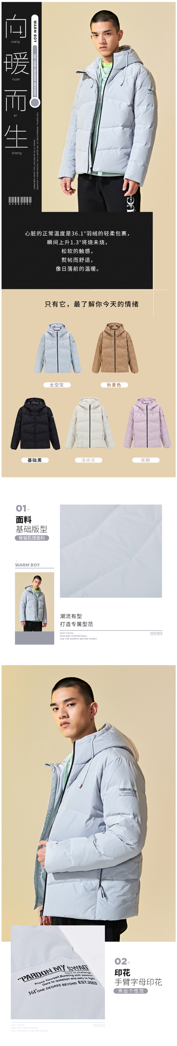 这款361度男连帽羽绒服,是2020秋冬新款,采用100%高密度涤纶面料,紧实严密,防风防雨。内里填充100~150g的鸭绒,充绒量达80%,算是薄款和中厚款之间的一个过渡,适合零下5~0度的天气穿。