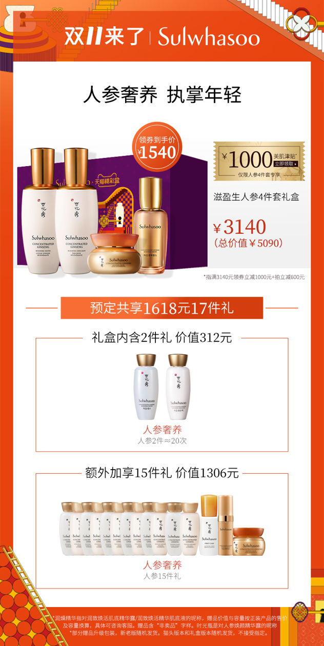 =1540元 到手价(定金100+尾款1440),蕴含灵魂成分Ginsenomics™传奇赋活精萃,结合生物转化科技及活能封存技术,甄选30种人参皂苷,6000倍高浓度活效精粹。凝萃珍稀抗老能量,重塑年轻轮廓,焕活肌肤传奇“参”命力