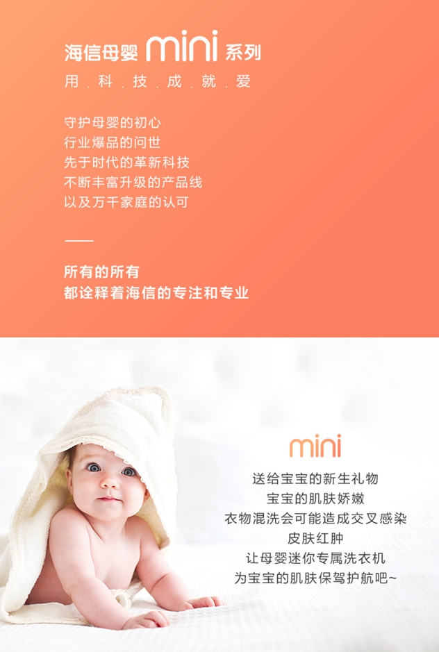 海信型号为HG30V75F的变频滚筒迷你洗衣机,洗涤容量为3kg,壁挂式迷你,宝宝专属,节省空间;巴氏除菌,食品级除菌除螨,呵护宝宝娇嫩肌肤;全触控设计,操作灵敏,显示直观;智能WIFI,阿里云智能,APP远程操控;BLDC变频,睡眠级静音,脱水效果好。