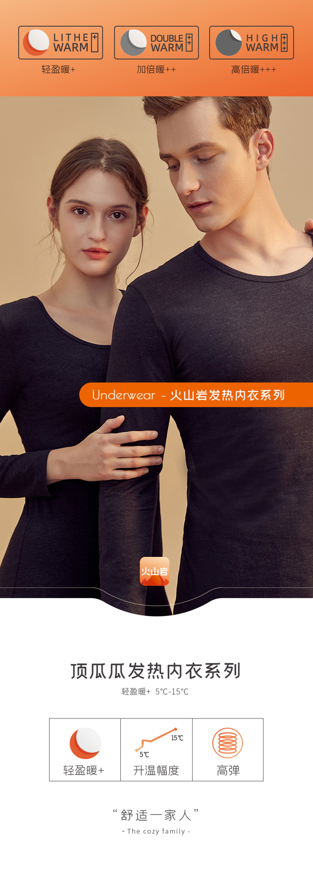 顶瓜瓜火山岩发热系列保暖内衣,采用黑科技新型火山岩发热纤维,多股捻丝织筑蓄热间隙,还融入了纳米级火山岩多孔粉体双重蓄热,这种面料的特点是轻盈高弹,上身自由随型不束缚,通过蓄热间隙轻松蓄暖,不因时间和洗涤过程而消失。