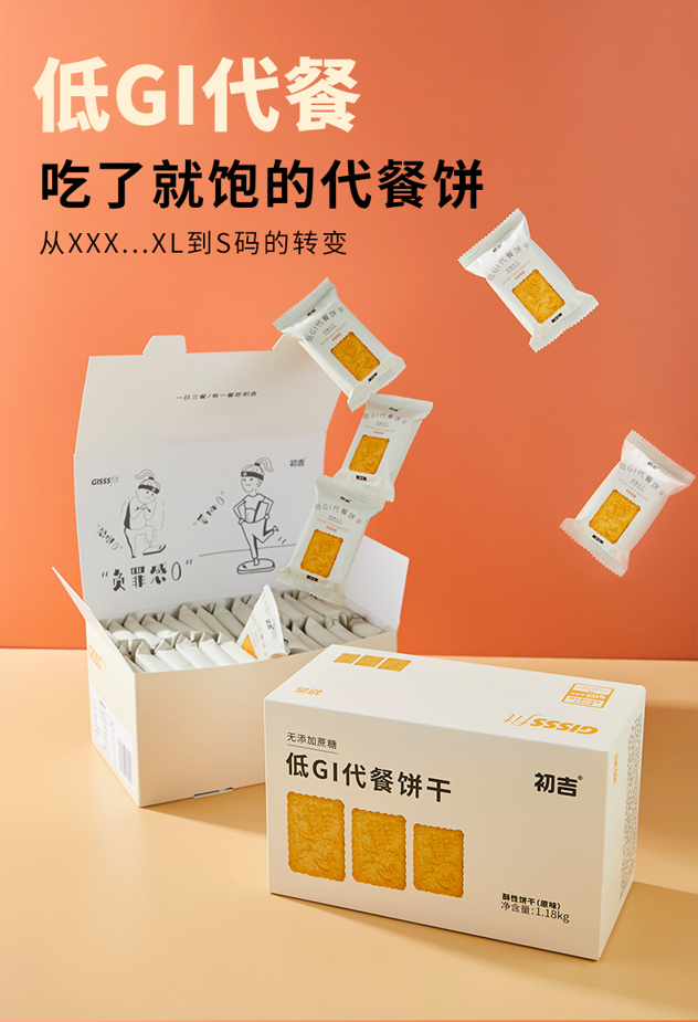 有原味、海苔、香葱三种口味可选。这款初吉 低GI全麦饼干,全麦粉≥50%,是一款高膳食纤维的无糖饼干,适合减肥瘦身人士食用,或者不想发胖的人吃。甄选小麦、荞麦、黄豆、魔芋、芹菜制成,一包饼干的热量=半个苹果,少摄入高饱腹,吃一餐可抗饿5个小时,规格是1180g/箱。
