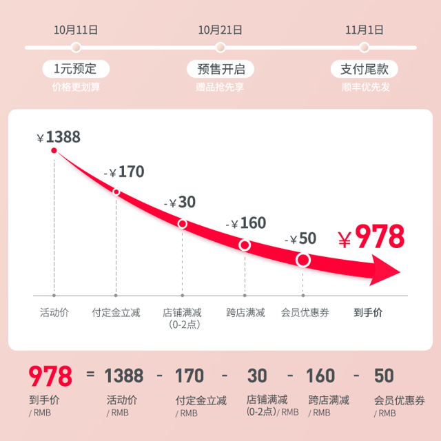 天猫精选预售价1388元,支付定金150元,立减170元,1日前2小时付尾款立减30元,叠加跨店每满300-40的,做到978元包邮,套装包括150ml*2加储物盖*4和240ml奶瓶*2加吸奶转换器*2,礼盒好价,需要的买买可以关注。
