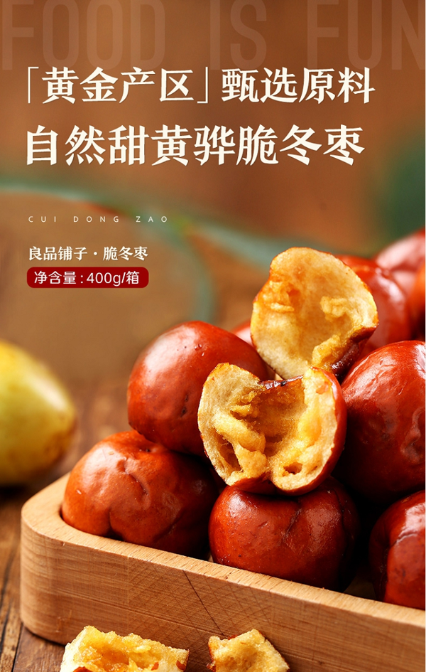 良品铺子这款黄骅脆冬枣,1斤脆枣需要5斤生枣制成。采用先进设备去核,独特工艺在低温真空下直接把鲜冬枣脱水制成,既保留了鲜冬枣的营养,且口感更加酥脆香甜,食后回味无穷,是高档的健康食品。