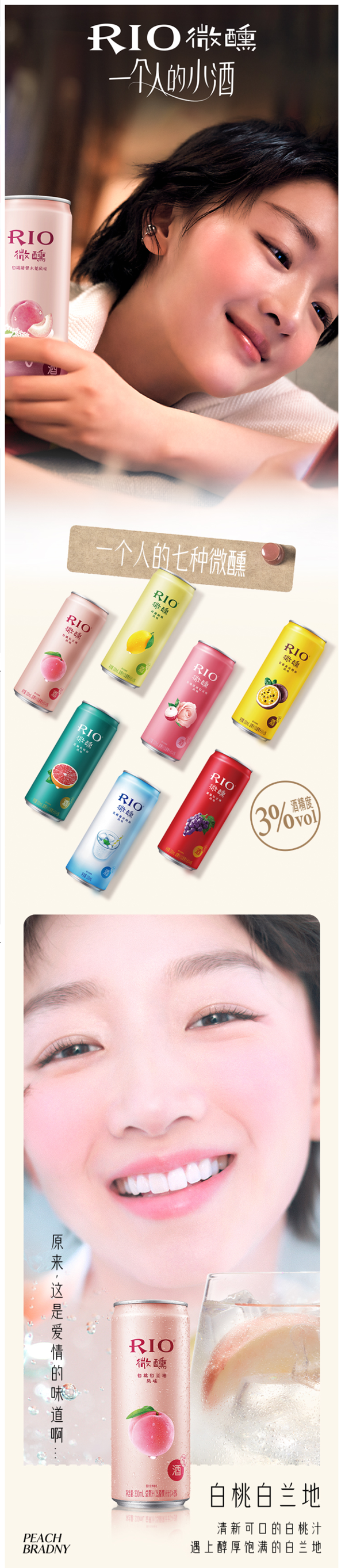 Rio新品3°微醺,目前最有名的预调制鸡尾酒品牌之一,7口味组合装,有百香果味*4罐、玫瑰荔枝味*4罐、白桃味*4罐、乳酸菌味*2罐、葡萄味*2罐、西柚味*2罐、柠檬味*2罐,酒感明快且具有果香,刚刚好的微甜,似醉非醉,余味悠长。