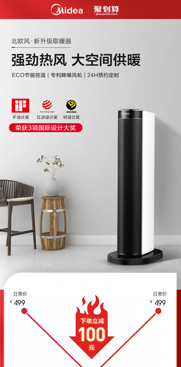 天猫美的凯迪专卖店499元,下单立减100元,可领100元优惠券,实付299元到手,美的WIFI智能立式取暖器,ECO智能恒温,室温低于26度自动加热,高于26度自动停止加热,不再忽冷忽热,省电省心。「双11红包来啦」