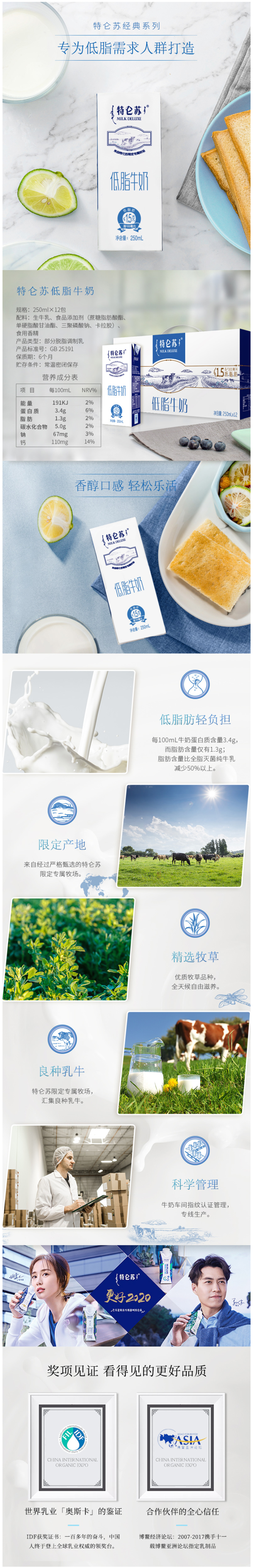特仑苏是中国市场上第一个高端牛奶品牌。坚持业内高标准的原料甄选和生产工艺,为消费者提供至高品质的营养,并逐步成长为全球销量领先的高端牛奶品牌,品牌标语“不是所有牛奶都叫特仑苏”家喻户晓。得天独厚的条件,严格对品质的要求,是中国乳业的代表。牛奶口感香醇可口,奶味浓郁。